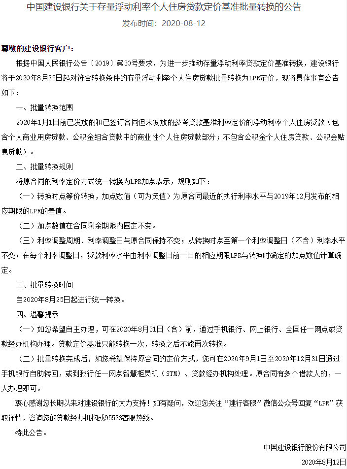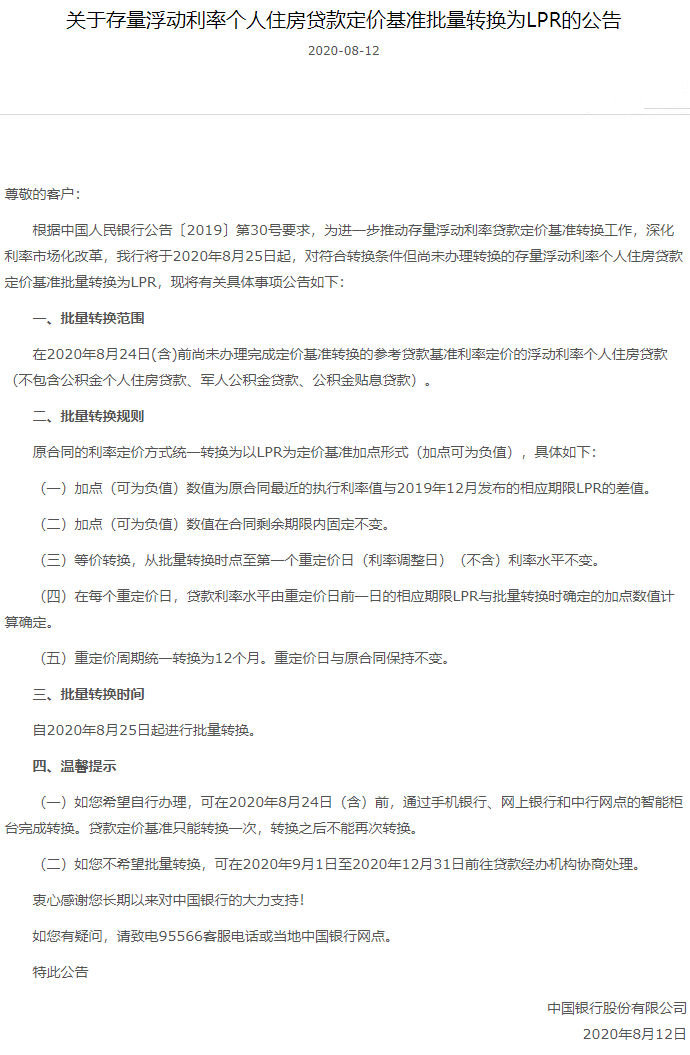 据悉,此前7月20日,交通银行已经发布公告,将于2020年8月21日对尚未转换为贷款市场报价利率(LPR)或固定利率的存量浮动利率房贷,统一调整为LPR浮动利率加减点方式。