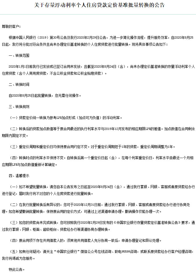 公告同时表示,批量转换完成后,若对转换结果有异议,可于2020年12月31日(含)前通过手机银行自助转回或与贷款经办行协商处理。