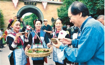 云南省红河哈尼族彝族自治州弥勒市西三镇可邑特色小镇浓厚的民族文化和绿水青山生态环境吸引了大量游客。图为小镇热闹景象。普佳勇摄(人民视觉)