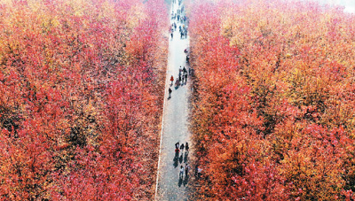 近日,山东省青岛市西海岸新区张家楼街道千亩枫林披换“红妆”,进入最佳赏叶期,吸引众多游人慕名而来打卡赏景。西海岸新区将农林生产与文旅休闲相结合,打造出多个乡村旅游特色小镇,在促进生态保护的同时带动了当地乡村振兴与发展。图为游客在张家楼村枫林赏景游玩。新华社记者 李紫恒摄