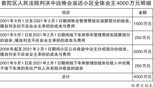2023年1月31日,上海市普陀区人民法院对该案宣判,支持了小区业主的诉求,判决中远物业公司返还全体业主共计4000万元,具体为:2001年9月1日至2021年2月1日期间,物业管理费按实结算部分的结余、擅自列支的不应由业主承担的成本与费用1500万元;2001年9月1日至2021年2月1日期间,地下车库停车管理费按实结算部分的结余、擅自列支不应由业主承担的成本与费用250万元;2008年起至2021年2月1日期间,小区公共收益中业主分成部分的结余、擅自列支不应由业主承担的成本与费用2000万元;2001年9月1日至2021年2月1日期间,地下车库新增划线车位收入中应属于地下车库的车位产权人共有部分收益的结余250万元。