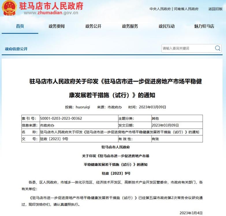 中新网3月9日电 据驻马店市人民政府网站9日消息,驻马店市人民政府近日印发《驻马店市进一步促进房地产市场平稳健康发展若干措施(试行)》的通知。通知重点从落实企业扶持措施、支持合理住房需求、完善金融服务、优化房地产市场环境、多措并举去库存方面,本着实用性、灵活性和可操作性相结合的总体思路,归纳提出了二十七条内容。